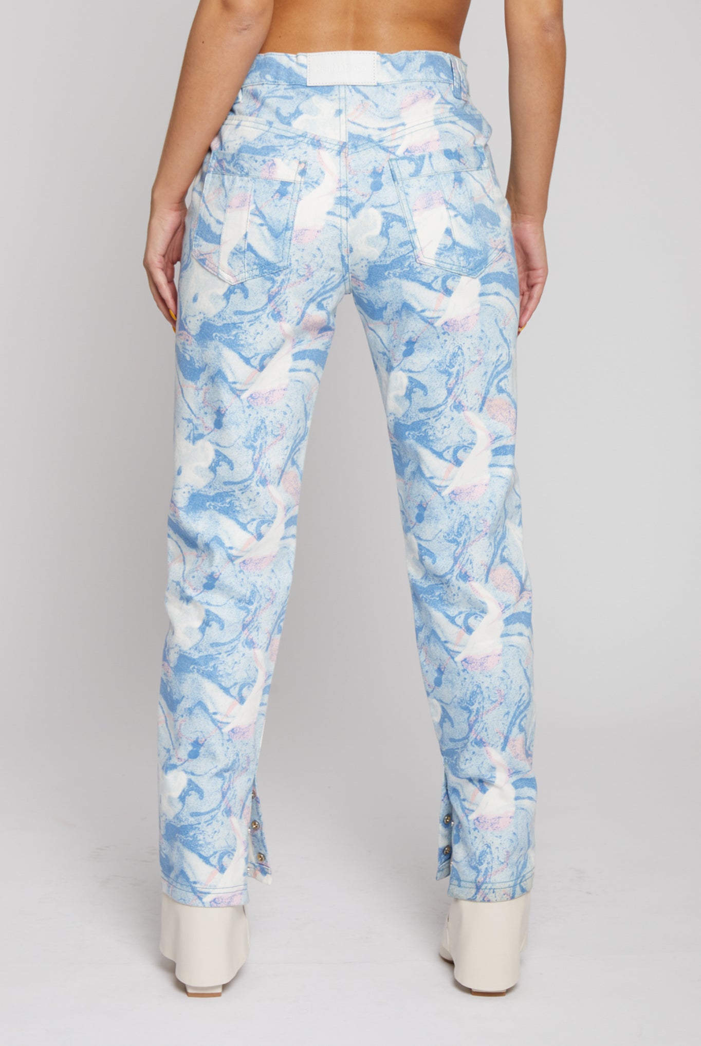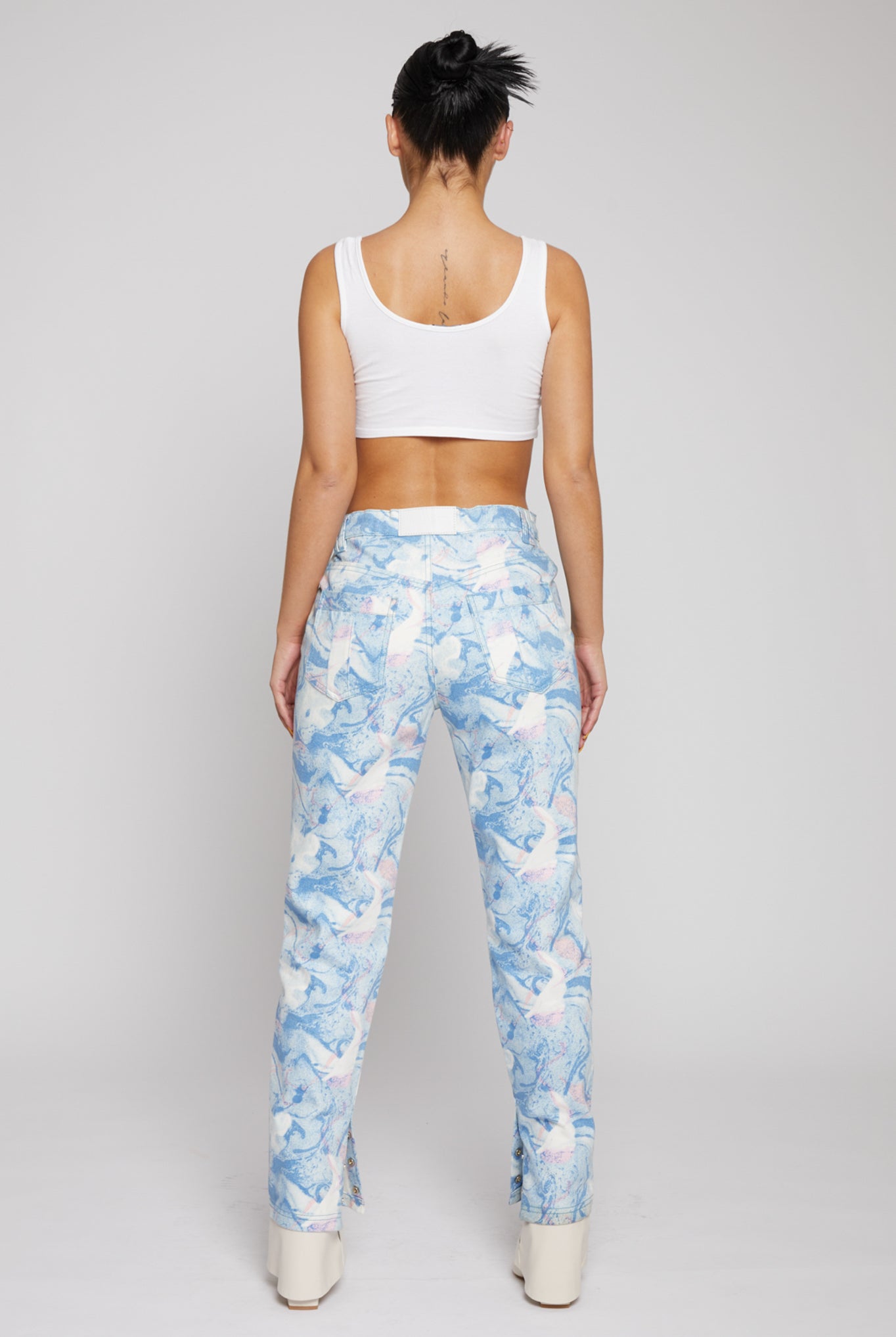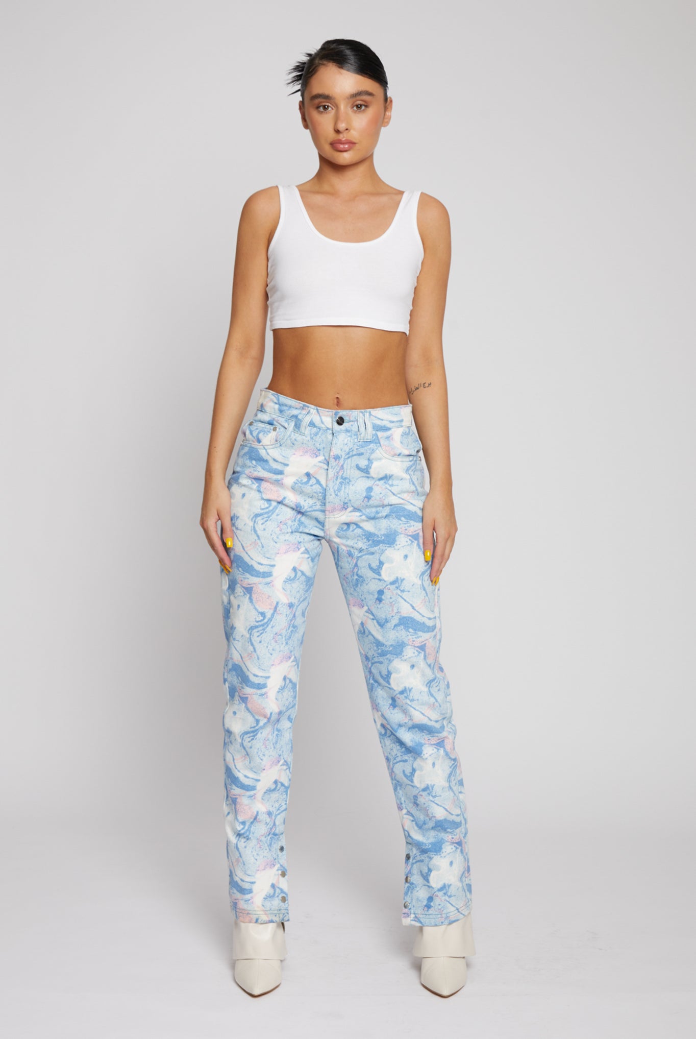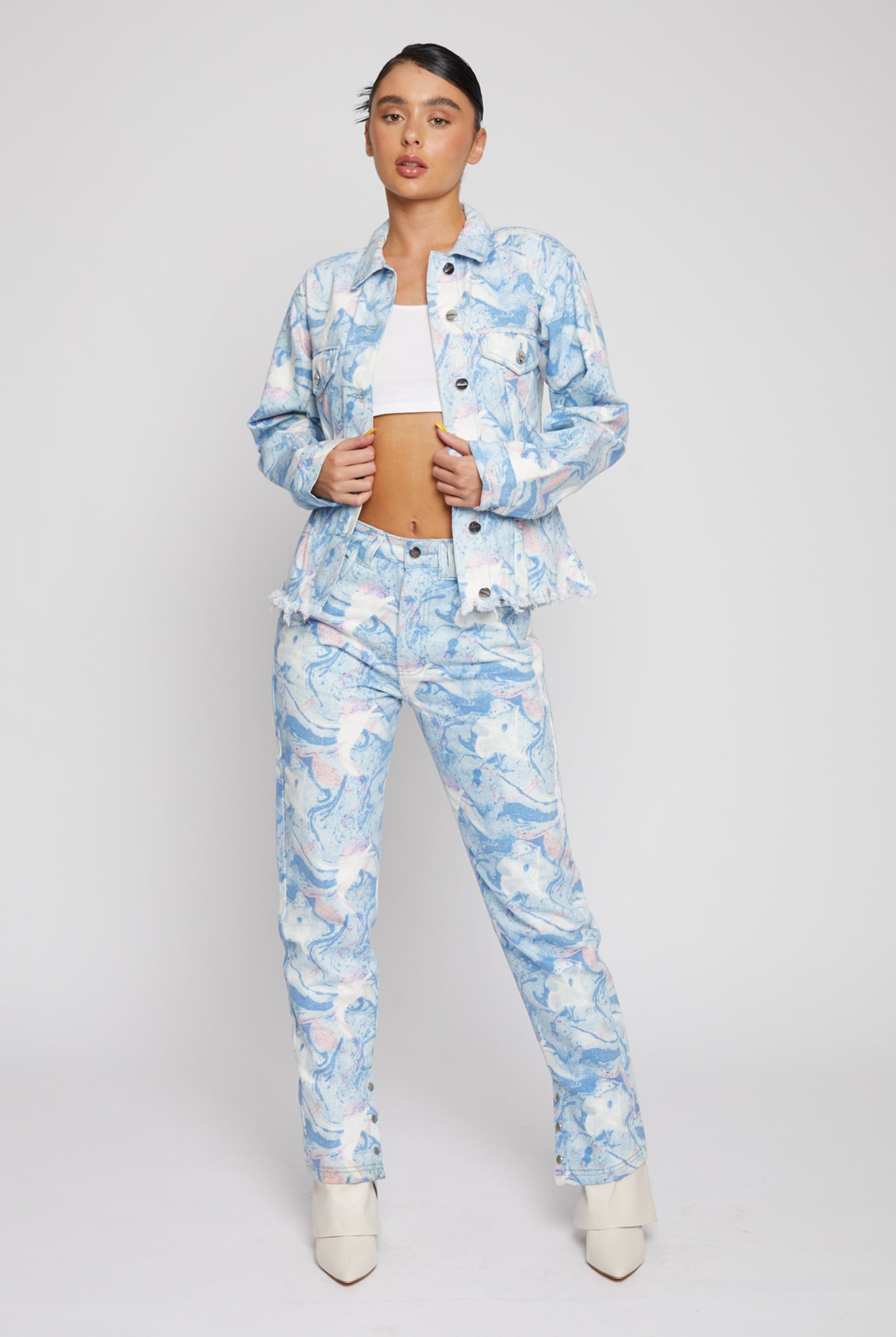 Looking for a new statement piece to take your outfit game up a notch? Meet your new psychedelic marble print straight leg jeans. With their premium denim fabric, distinct print, and frayed detailing, these jeans will make a statement no matter where you wear them. They also feature internal waistband adjusters for a comfortable and customized fit, and a high rise silhouette that is both fashionable and flattering. Plus, the silver poppers to the split hem add a touch of cool. Best of all, they are super comfy – you’ll never want to take them off!