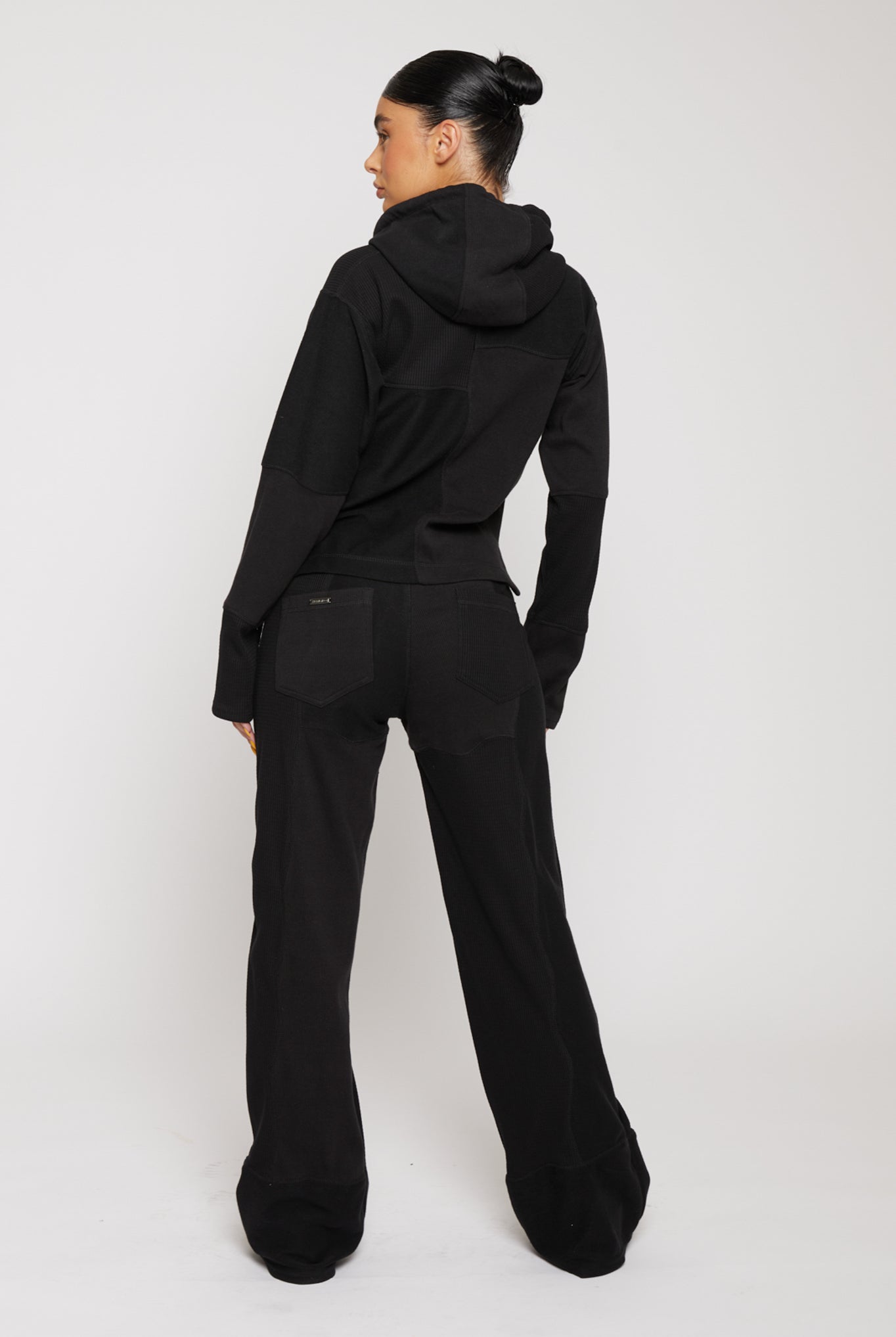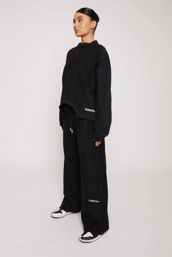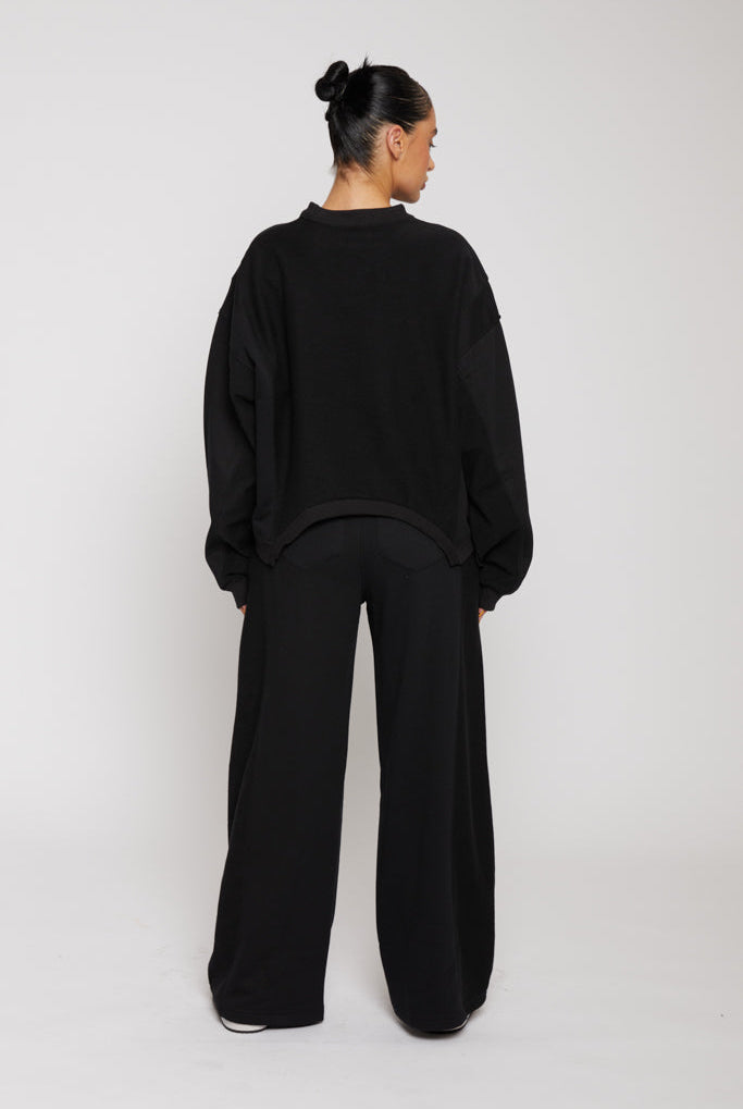 Looking for a fashionable and comfortable way to style up your athleisure look? Check out our premium women's black wide leg mixed fabric joggers, made with ultra-soft mixed cotton fabric for luxury comfort. The overlock stitch detail adds a touch of luxury. With an oversized fit for a relaxed feel, these joggers are perfect for running errands or hitting the gym. Plus, the brushback quality of the fabric is extra soft, making them ideal for lounging around the house. Our wide leg joggers are sure to elevate your athleisure style.