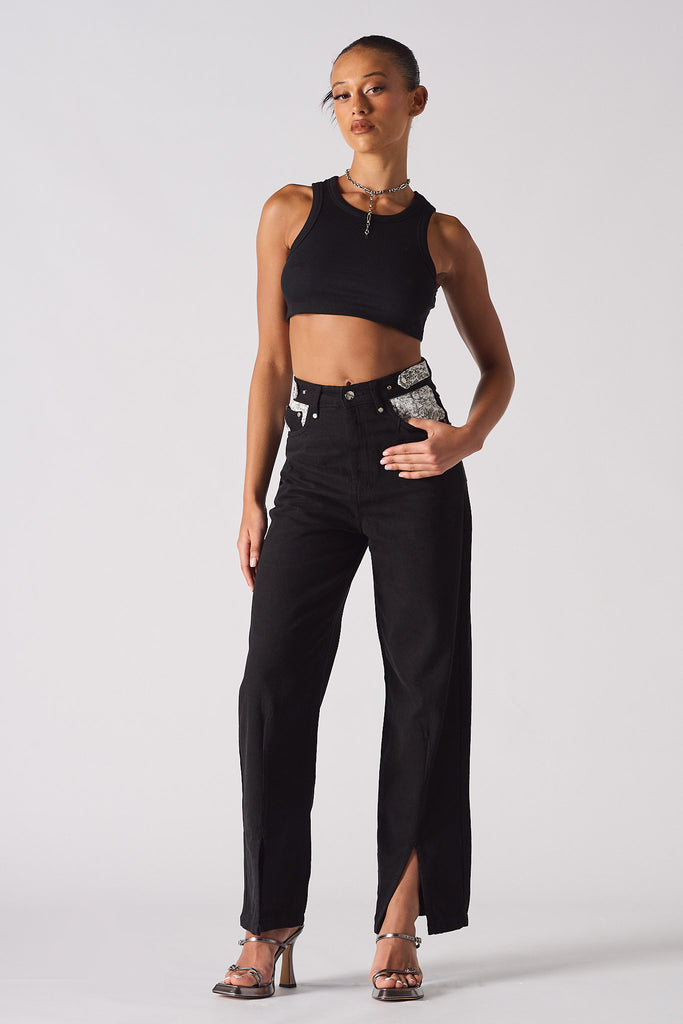 These baggy jeans are perfect for a modern, trendy look and will give your casual wardrobe a facelift. Made from premium black wash denim, and feature internal waistband adjusters for a perfect fit. The wide leg silhouette and unique split hem style make these jeans super comfy and luxurious. Plus, the printed pockets add a touch of personality. Dress them up or down – however you wear black wash baggy jeans, you're sure to turn heads!