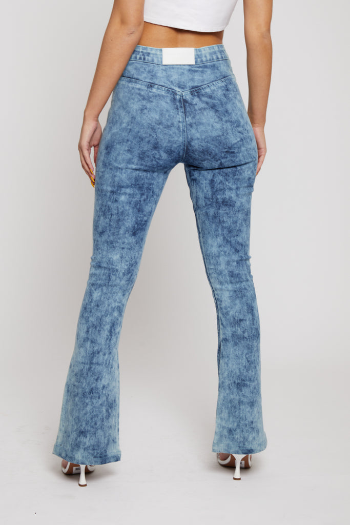 Introducing our newest addition to the denim collection – the bleach wash flare jean! This super stylish and versatile piece is perfect for any occasion. Made from stretchable bleach wash denim fabric, it is comfortable and figure-flattering. The internal waistband adjuster adds a touch of functionality. Whether you're dressing up for a night out or keeping it casual for a day in, the bleach wash flare jean is your go-to denim choice.