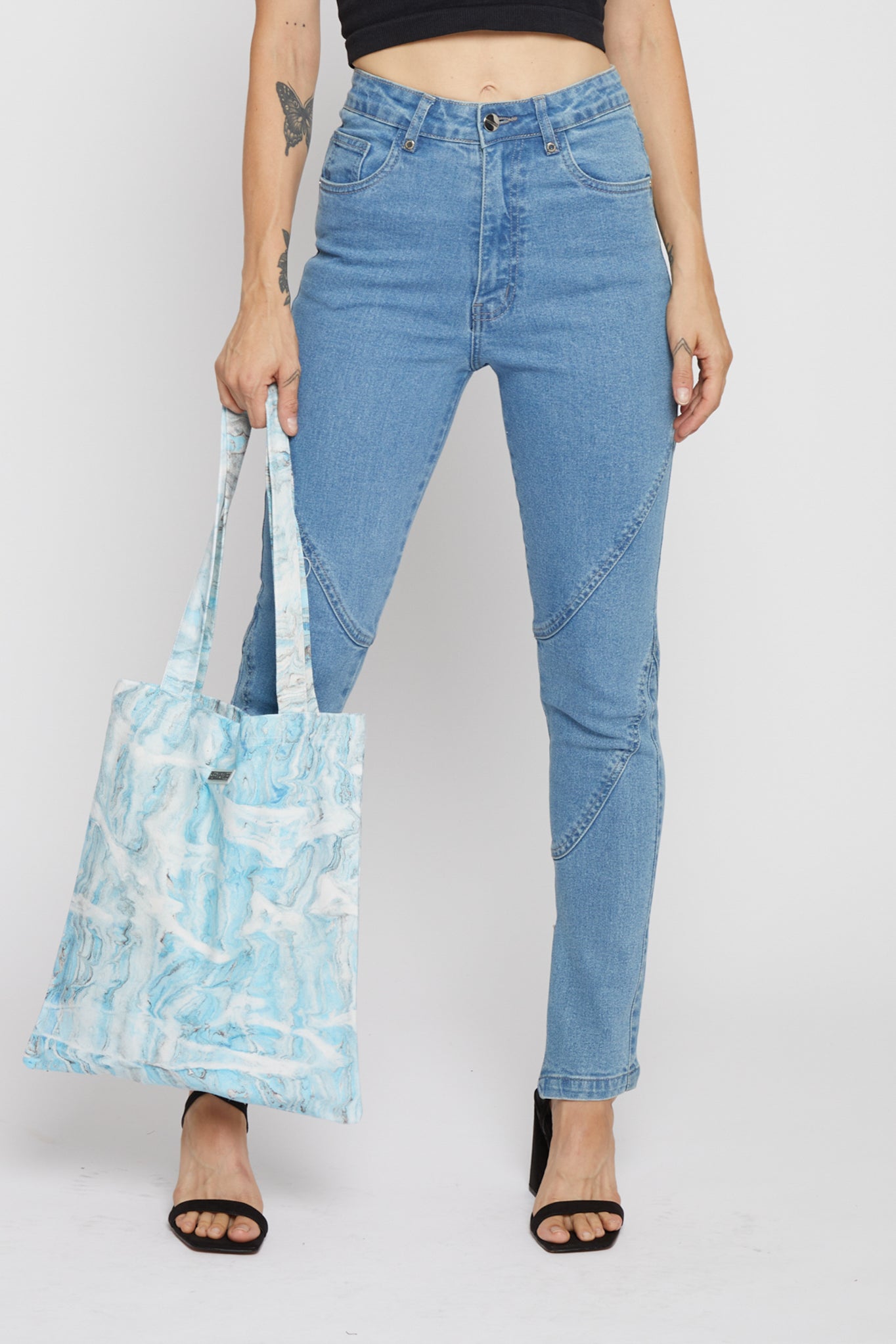 Herman&Co's Upcycled Hand Dyed Denim Tote Bag is the perfect way to carry your things in style! ! It is made of 100% cotton and features silicone branding on the front. With a limited number of pieces, this stylish and sturdy tote bag makes the perfect everyday accessory. Whether carrying your laptop, groceries, or daily essentials, this tote bag will make it easier than ever. Add our Marble Grey Blue Denim Tote Bag to your collection today!
