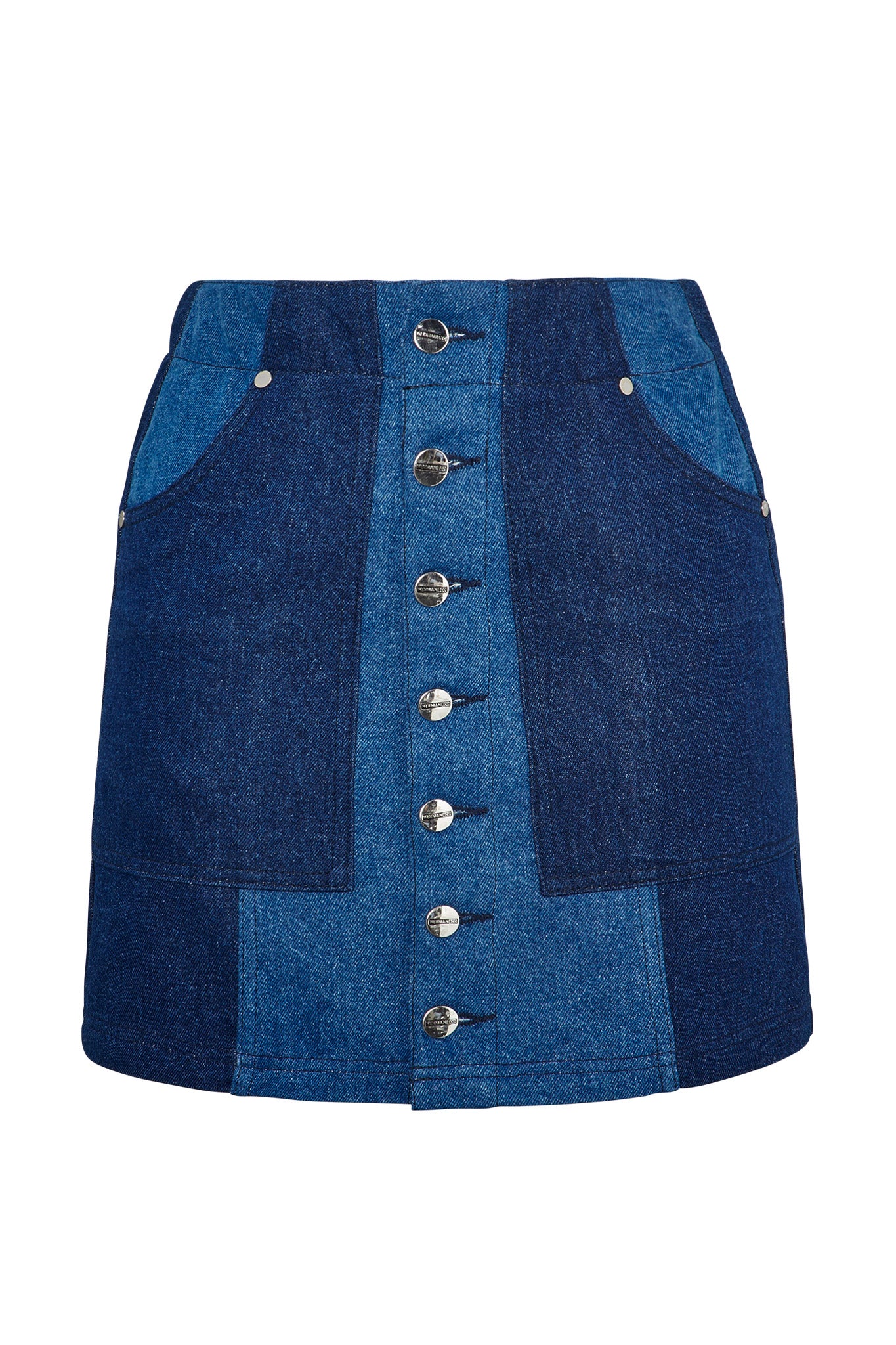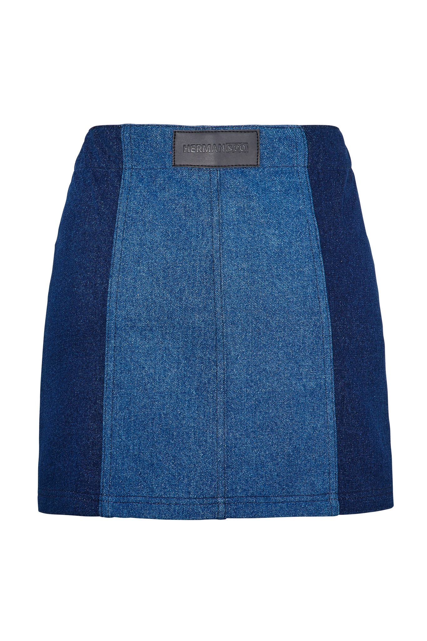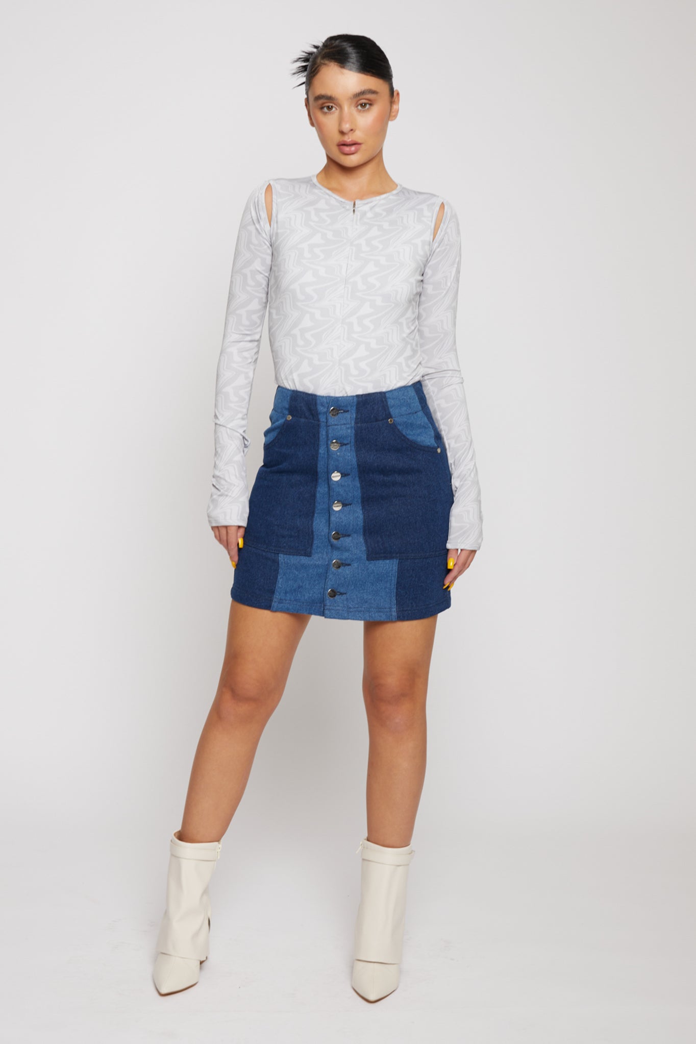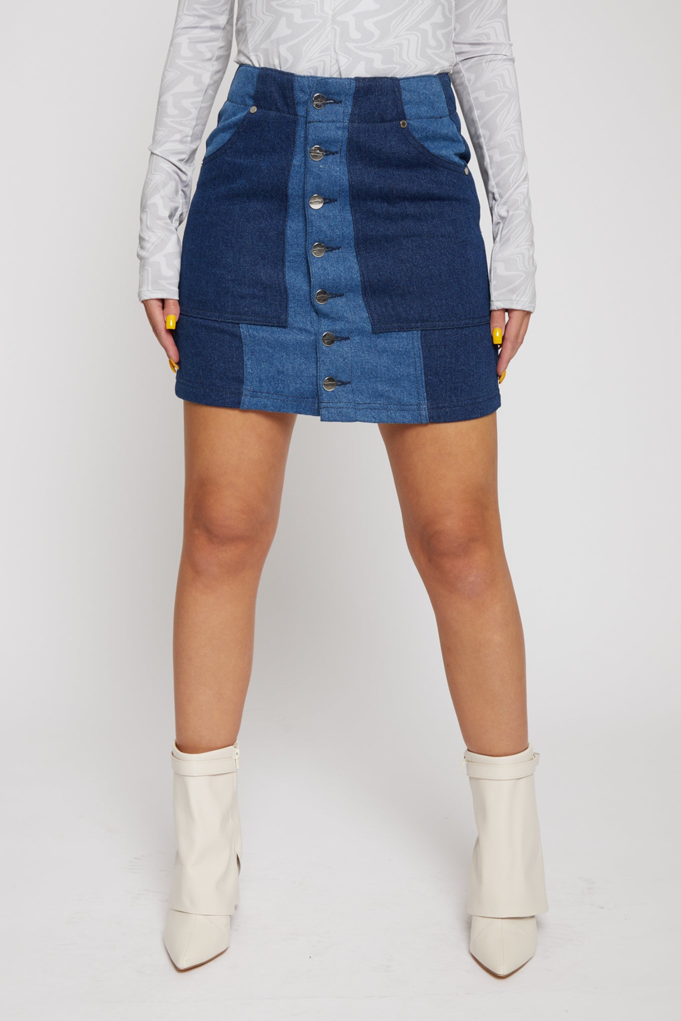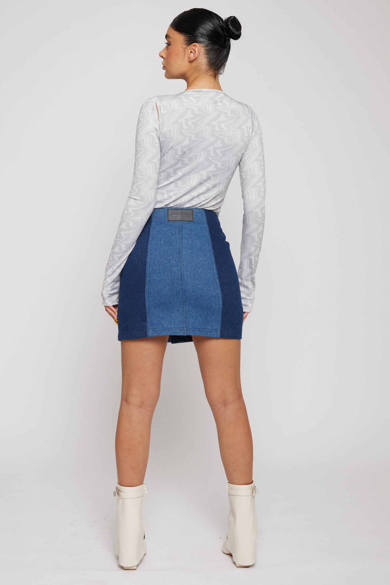 HIGH WAISTED CONTRAST PANEL DENIM SKIRT - BLUE