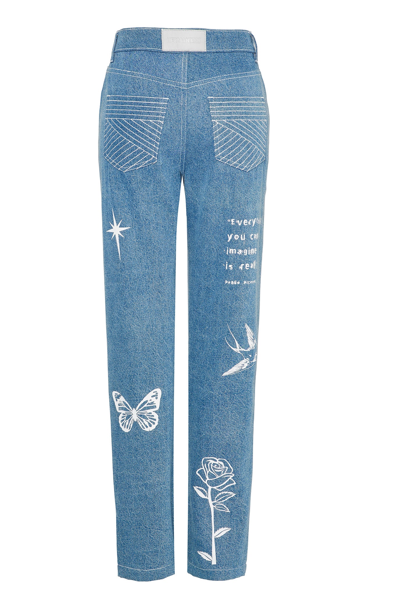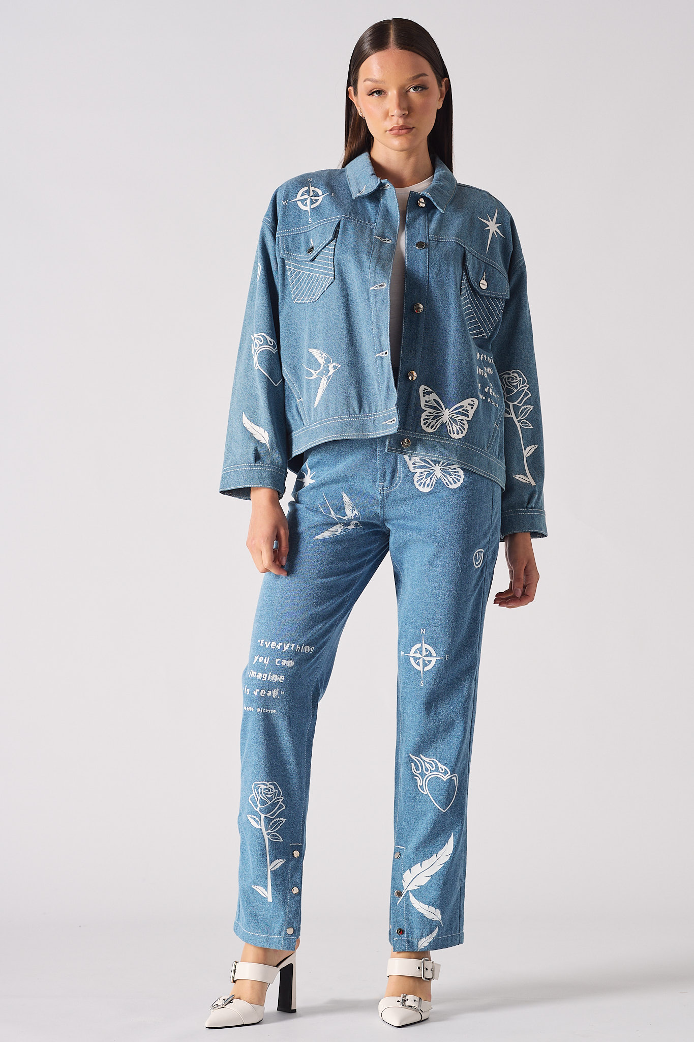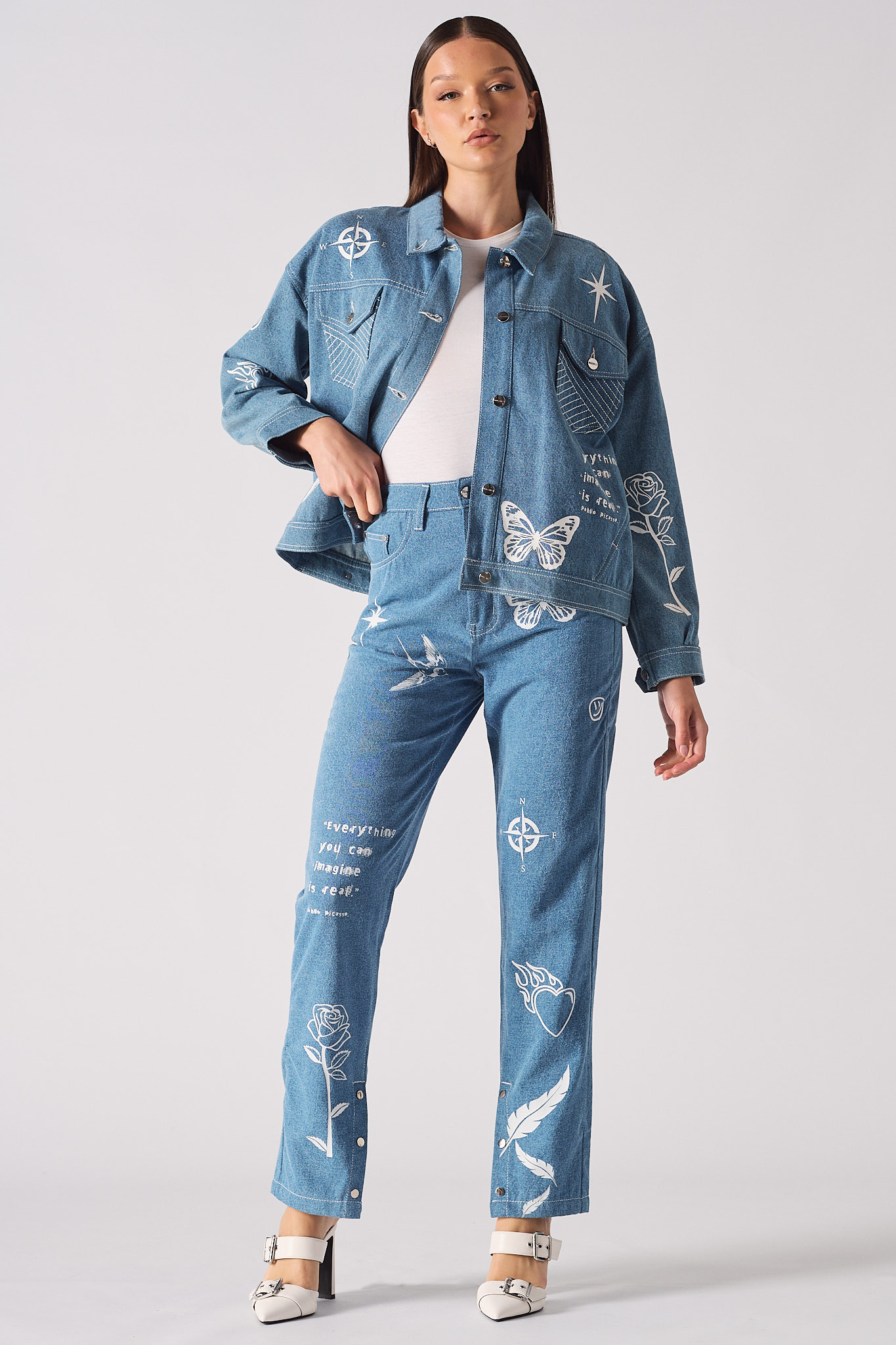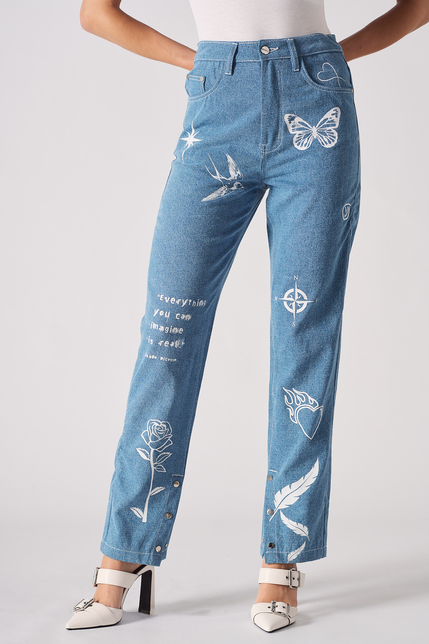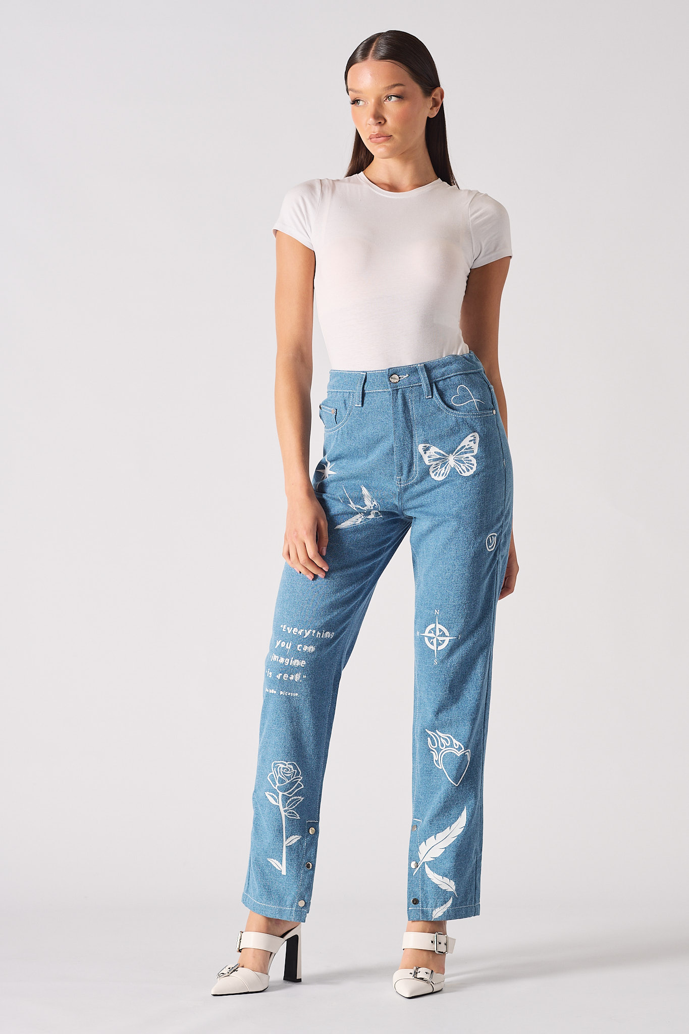 Take your look to brand new heights with this must-have jean. The comfortable fit and modern silhouette combine to create a stylish and flattering look. With a versatile mid wash, tattoo print denim straight leg jean can be dressed up or down for any occasion. Pair it with your favourite blouse and heels for a night out, or wear it with a tee and sneakers for a casual day around town. No matter how you style it, you'll look and feel your best in this jean. So what are you waiting for? Give tattoo print straight leg jean a try today! You won't be disappointed.