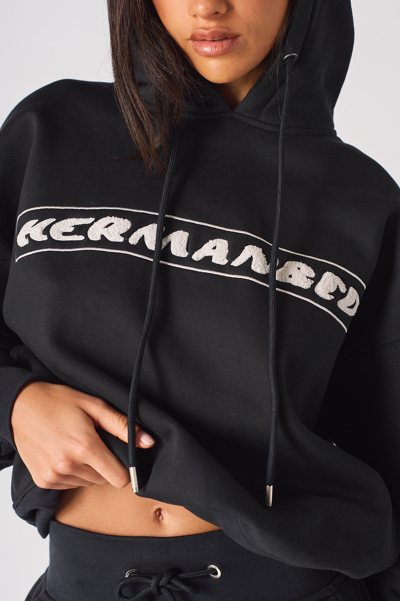 Effortlessly cool with a touch of sophistication, this modern take on a streetwear staple is crafted from premium cotton. It offers a relaxed, oversized fit that drapes over the body. The drop shoulder sleeves and drawstring hood contribute to a slouchy silhouette while providing warmth and style. A tonal slogan on the chest adds subtle branding. This versatile piece pairs well with tailored trousers for a refined look or denim for casual wear, transitioning seamlessly from day to night.