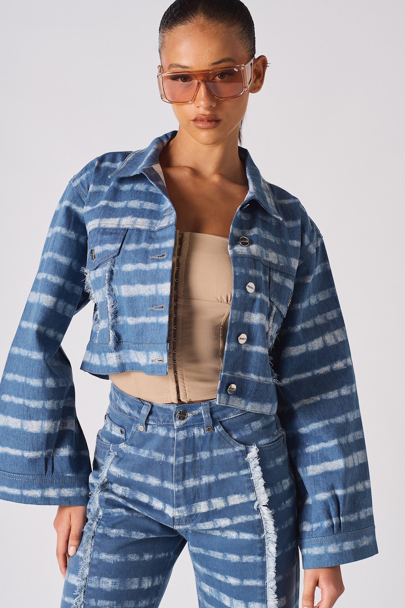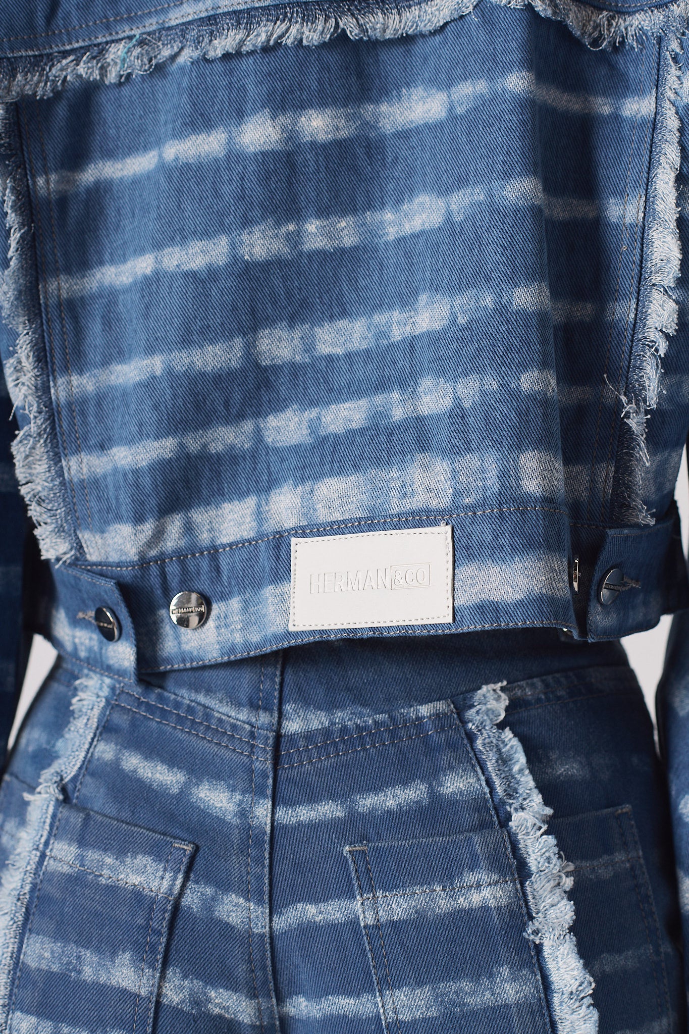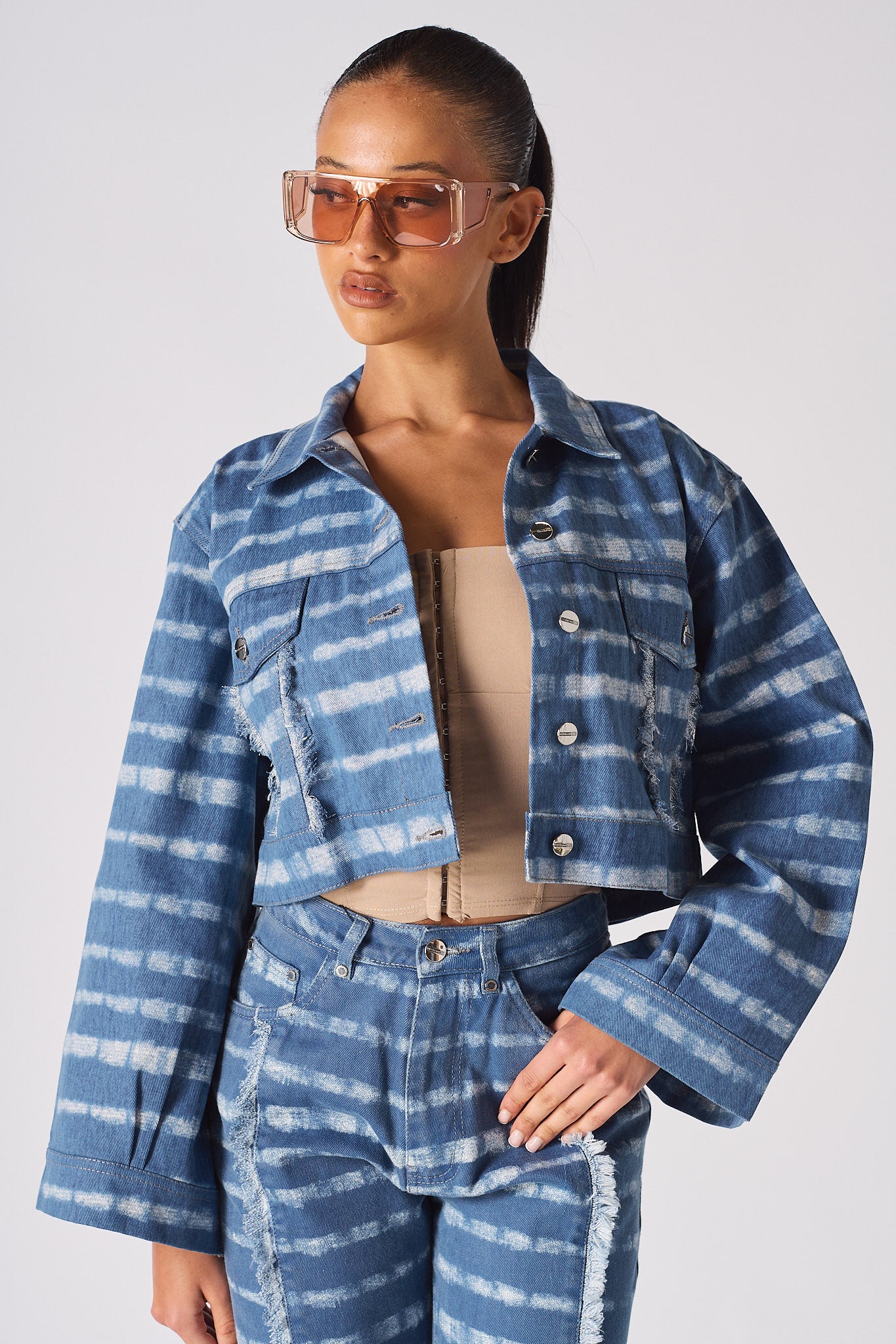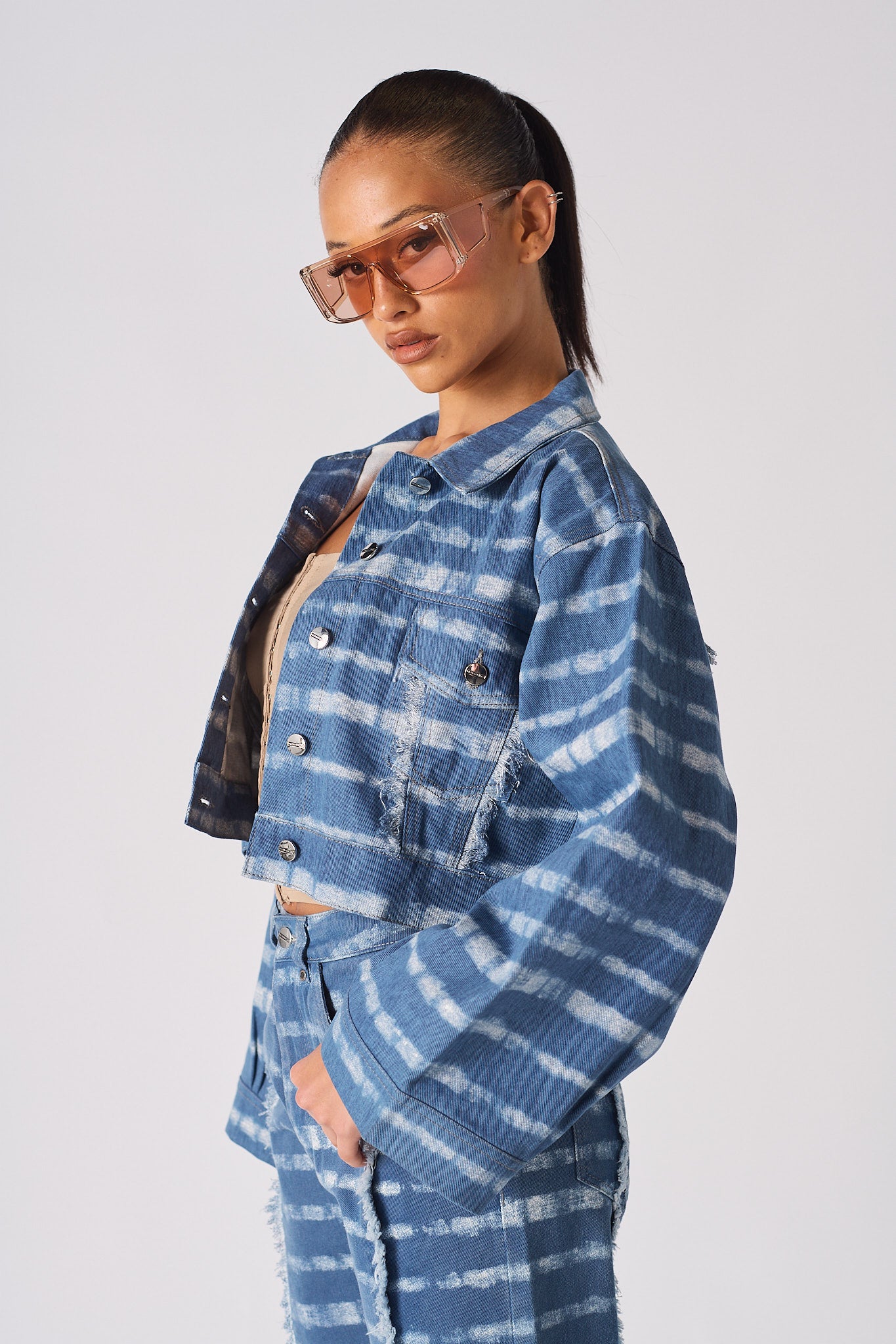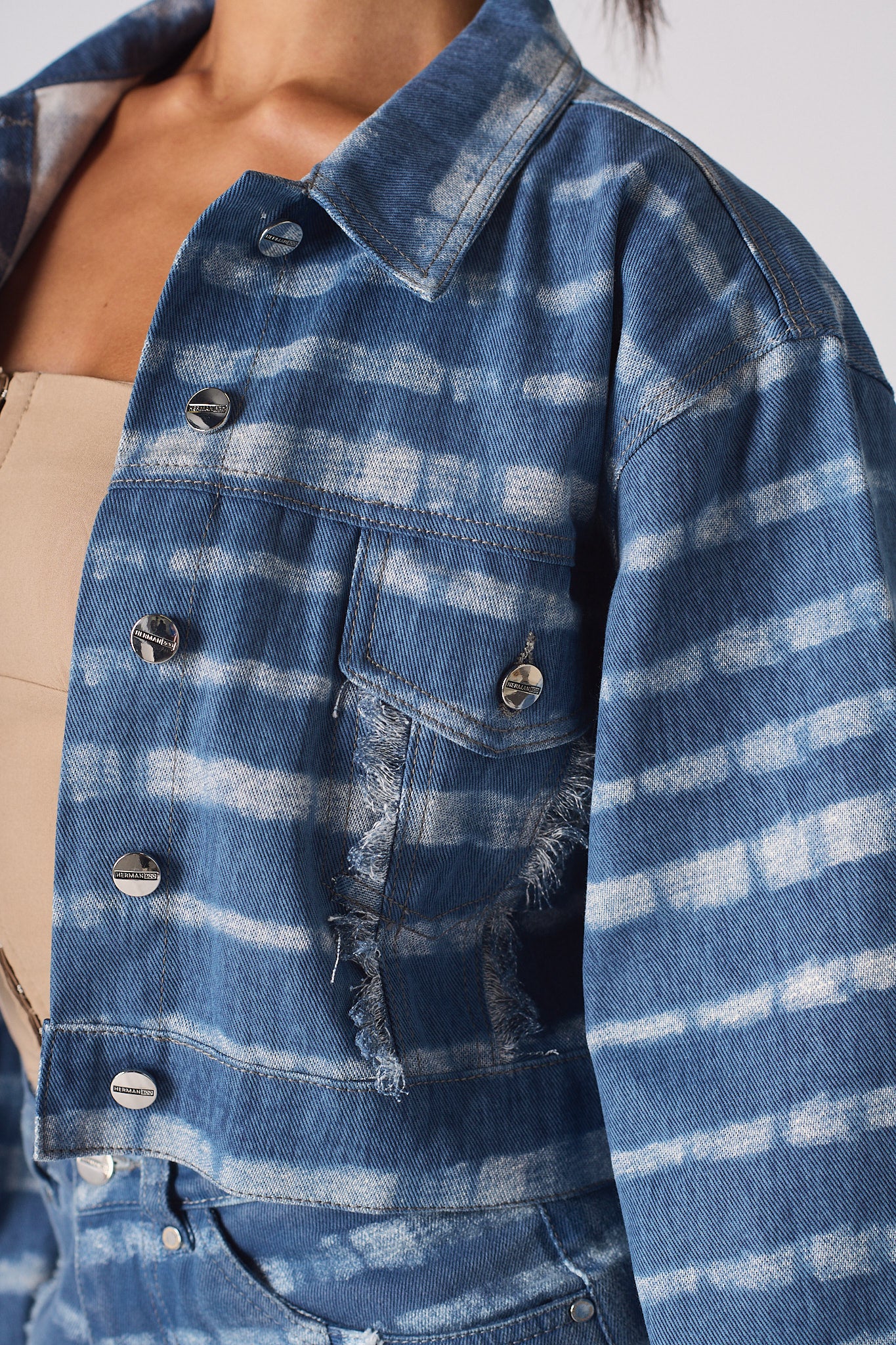 Add some cool vibes to your wardrobe this season with our fabulous cropped denim jacket! This piece is 100% denim and features a white mist print on light wash denim fabric that is perfect for a day out and about, while the wider sleeve gives you a bit of extra coverage. The crop body style is on trend and looks great with a pair of matching jeans. Plus, the shank opening makes it easy to slip on and off. So don't wait any longer, grab our white mist printed cropped denim jacket today!